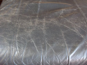 | Esta almofada de assento tem muito uso e um desgaste grave na superfície. A cor está a abrir gretas e a expôr a cor natural por baixo. O Bálsamo de Coloração de Couro na cor azul marinho foi usado para restaurar a cor. | |